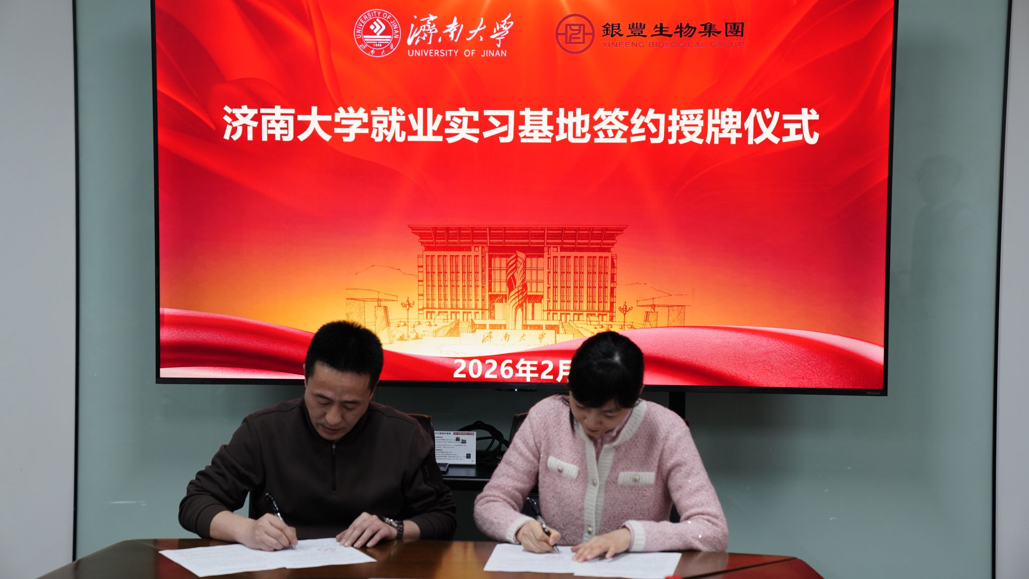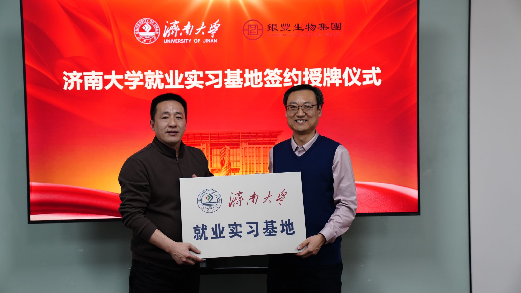 会议期间,举行了济南大学就业实习基地签约授牌仪式,杜艳与陈守林签署了就业实习基地合作协议,史国普与陈守林为实习基地授牌。